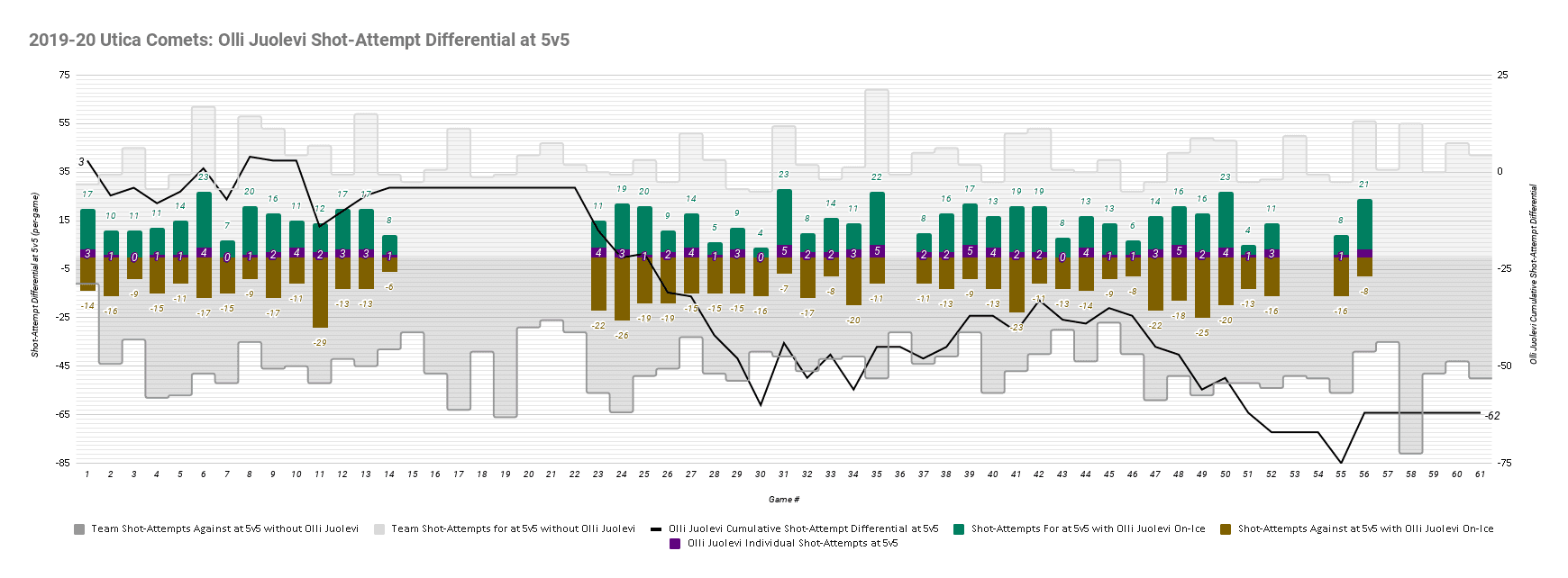 Here’s an excellent graph by Cody Severtson of PITB that depicts what Juolevi did on a nightly basis for controlling shot attempts.