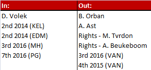 Vancouver spent some of these acuumulated picks to acquire 19-year old Czech forward Dominik Volek from the Red Deer Rebels. Despite having a year of WHL eligibility left, this is probably a straight rental for Vancouver, as Volek has stated that he’d like to play pro hockey next year, whether it’s in the AHL or back in Europe. Volek is a definite major upgrade on Ast in Vancouver’s top-6 as he had 15 goals and 9 assists in his 34 games with the offensively challenged Rebels, and has already added 2 goals and 1 assist in his first two appearances with the Giants. Red Deer will recieve a 4th round pick next year and a 3rd round pick in 2016 from Vancouver.