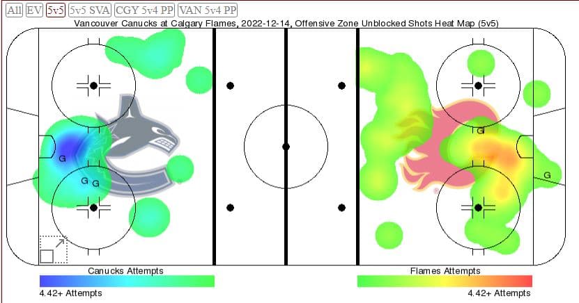 To Vancouver’s credit, if you’re going to have a blue piss stain anywhere on the heat map, you want it right in the goalie’s crease because goalies aren’t the biggest fan of shots directly in front of them. We’ve seen heat maps from the Canucks that looked like someone nervously blushing on their first date, two small dots just inside the blueline, and nothing more. If you’re going to go all in on one zone, the Canucks chose correctly.