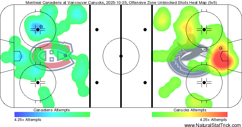 At the very least, this is the first heat map that definitely favoured Vancouver this season. While the overall scoring chances were just 28-16 at 5v5 action, the Canucks dominated in terms of high-danger opportunities. A 15-3 margin is great no matter how you look at it, and the only downside here is that the Canucks weren’t able to capitalize on it. It’s nice to see this at the end of a game, especially given that Vancouver hasn’t done this all season thus far.