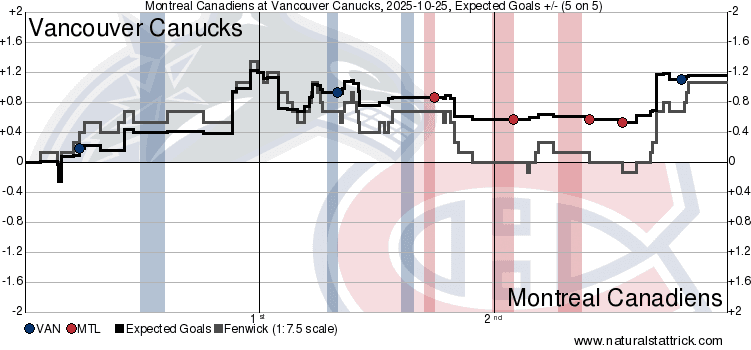 That all changed in the second period. After going up 2-0, Vancouver just let off the pedal. While that didn’t cost them initially, the lack of killer instinct allowed Montreal to get right back into the thick of things, recording a power play goal themselves and turning the flow into their direction. By the end of the middle frame, the Habs had 61.22 CF% and 65.59 xGF%, which they were able to carry into the third. Four unanswered goals isn’t a margin any team can afford to give up, and by the time the Canucks were able to respond with anything, it was far too late.