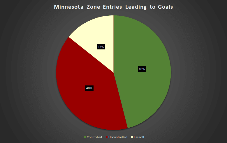 Further data showing the Wild’s reliance on the dump-in can be seen when looking at how they enter the zone preceding a goal. I took the liberty of manually tracking their last 68 even-strength goals dating back to January 1st.