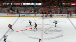 In the clip below, Washington is attempting to break into the Kings zone. The execution isn’t there and the Kings regain control of the puck but the important piece of information pertaining to Toffoli is how he reacts to the break-in attempt. If the puck were to make its way to the F1 of Washington, there is a potential of a 2-on-1 with F2 (Lars Eller #20).