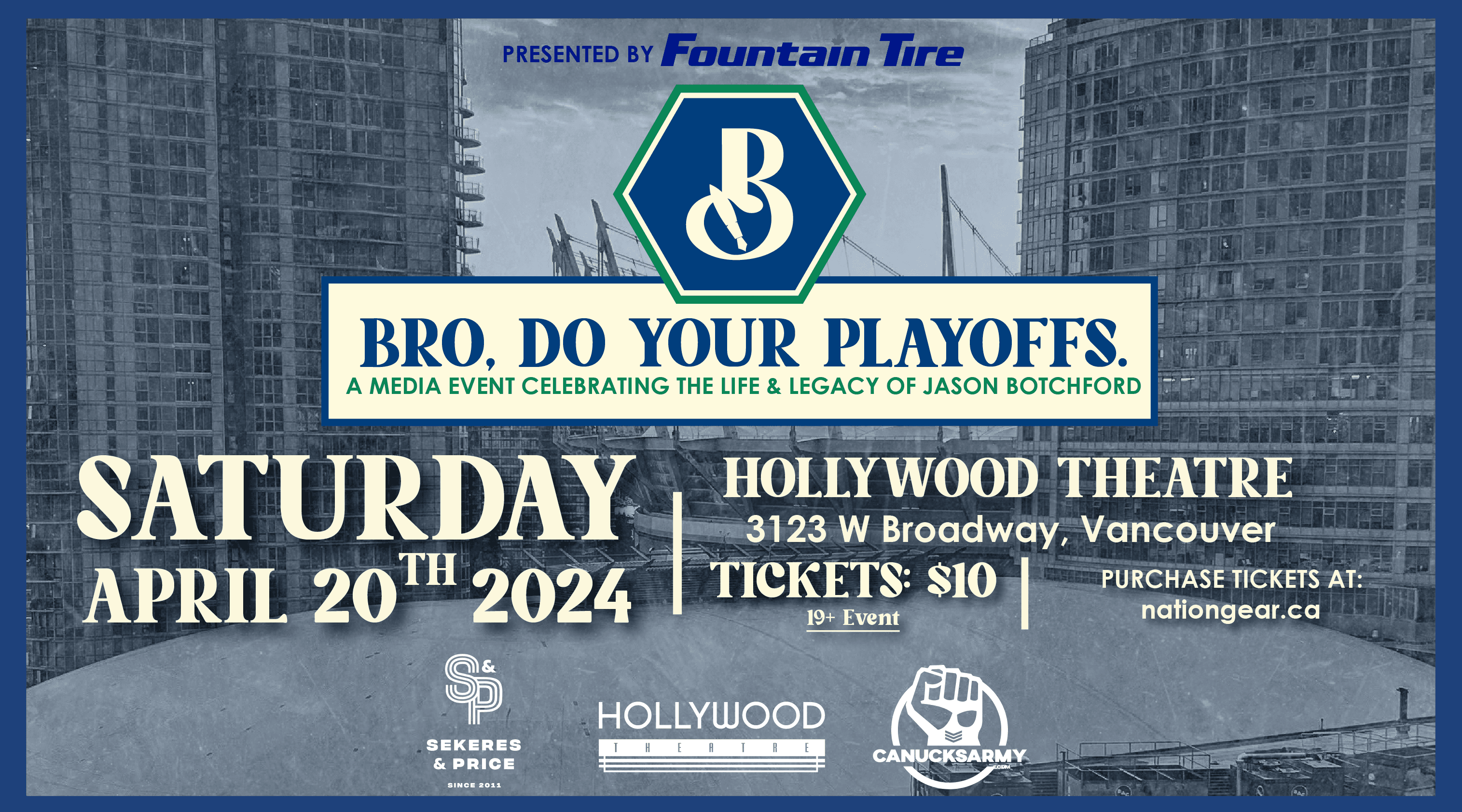 Join Sekeres & Price and the CanucksArmy crew on Saturday April 20th at the Hollywood Theatre in Kitsilano for a special tribute to their late friend, Jason Botchford, presented by Fountain Tire. “Bro, Do Your Playoffs” is a media event celebrating the life and legacy of Jason that will feature shared memories, special guests, an exclusive performance from The Matinée and the celebration of Vancouver’s triumphant return to the playoffs. This event is in support of the BC Mental Health Foundation. Get your tickets now at