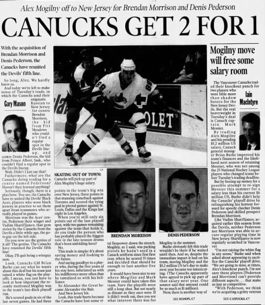 This week in 2000, the Vancouver Canucks acquired Brendan Morrison and Denis Pederson from the New Jersey Devils in exchange for Alexander Mogilny.