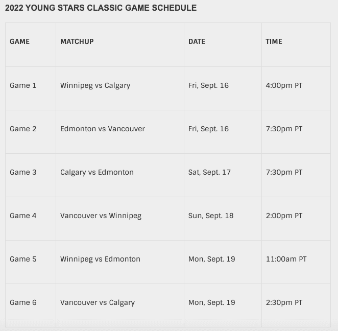 The six-game round-robin tournament kicks off on Friday, September 16th with the Jets taking on the Flames at 4 PM, followed by the Oilers and Canucks facing off at 7 PM and concludes on Monday, September 19th with Winnipeg vs. Edmonton and Calgary vs. Vancouver.
