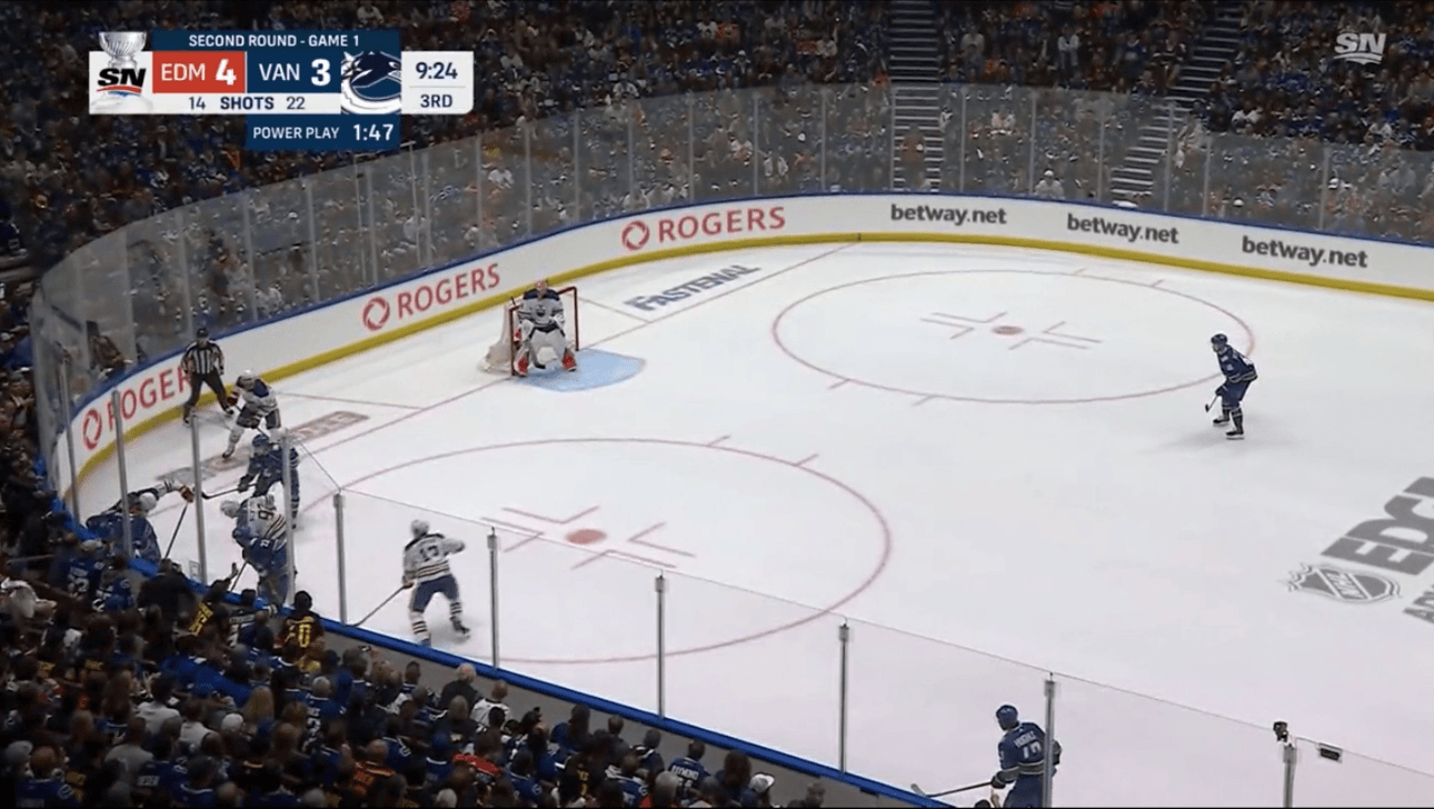 Let’s jump to Game 3 here. I know this play is on the far side, but Pettersson stays like a statue and is such a non-threat to the penalty-killers that they never even looked his way to make sure he was still there. It’s cause they know he isn’t going to move, so if the Canucks aren’t going to look his way, why should they?