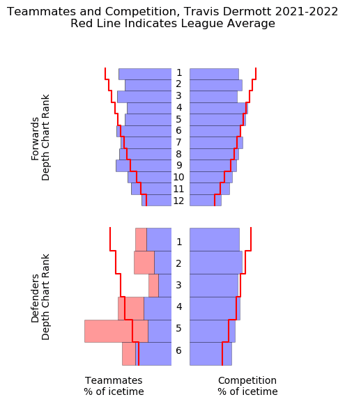 So, Dermott was sheltered in terms of his quality of competition, but he was also “sheltered” away from his most talented teammates much of the time. Taken in that context, his even-strength effectiveness is even more impressive.