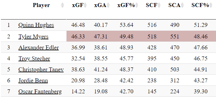 The exact same can be said for his Expected Goals For rate and measures of the scoring chances he allows. As it was in Winnipeg, Myers comes out looking like a slight liability – but still much better off than the majority of the Vancouver blueline.