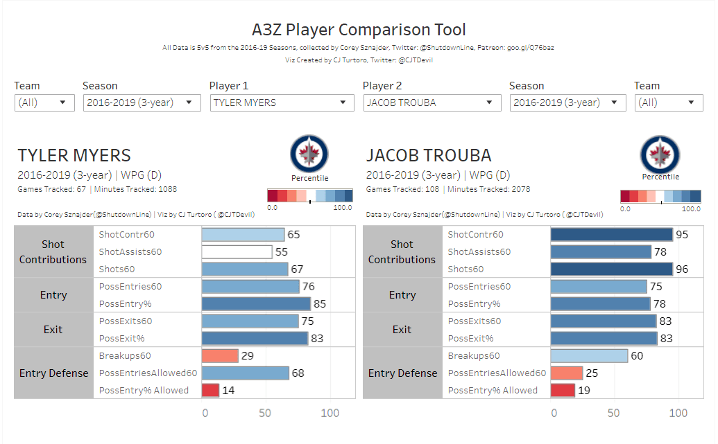 CJ Turtoro’s renowned A3Z Player Comparison Tool sees Myers as a player who continually struggled to break up opposing chances and deny zone entries, especially when compared to his fellow Winnipeg defenders.