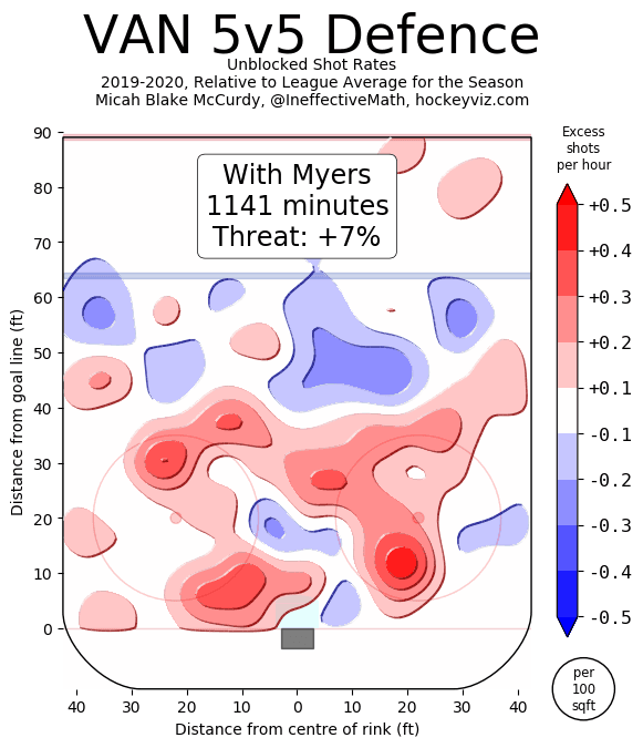 Micah Blake McCurdy’s visual charts also support the notion that Myers is performing roughly as well in Vancouver as he did in Winnipeg, and that he’s now just standing out more on a less-stacked blueline.