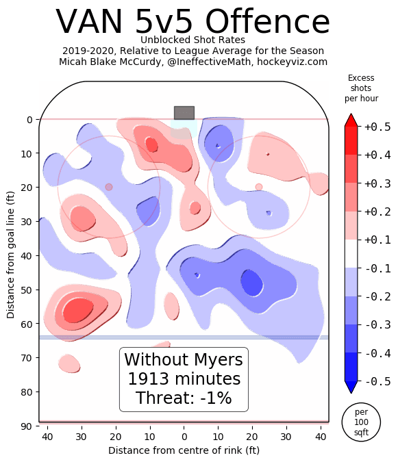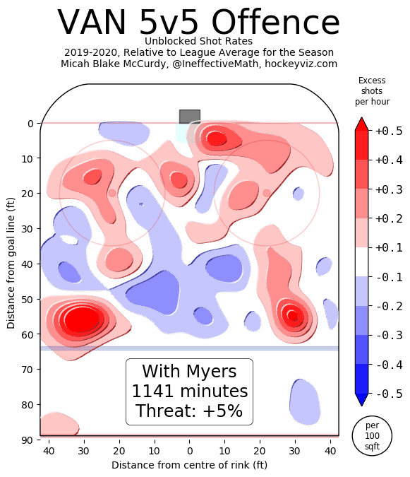With Myers on the ice, the Canucks direct far more shots at their opponent’s net than without. On the defensive side of the puck, he’s a largely neutral presence within the context of his fellow Canucks – but a significant step behind the league-average defender.