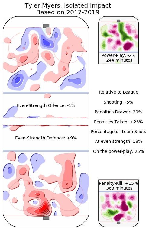 That swing was even more pronounced when it came to special teams. The Winnipeg powerplay was 2% less effective with him on it than without, and their penalty kill gave up 15% more shots when Myers was one of the on-ice penalty killers.