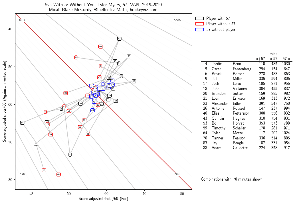 Though it’s a heavily criticized statistic, Micah Blake McCurdy’s measure of WOWY – or “With or Without You” – for the Canucks this season says that both Hughes and Alex Edler have played their best hockey alongside Myers.