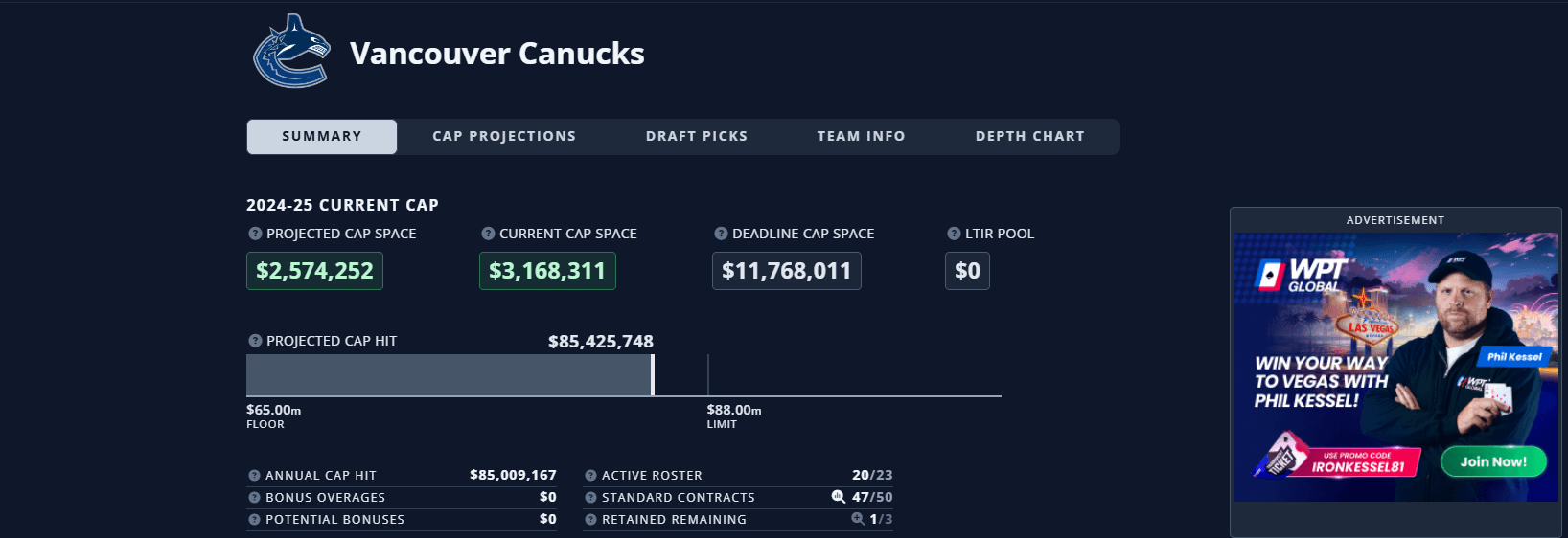 And yet, when we look at the PuckPedia page for the Canucks on this same day, we don’t see that number anywhere on the page.