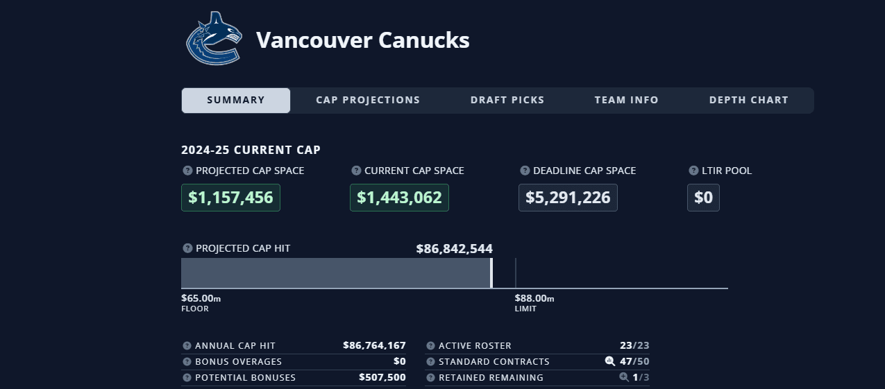 PuckPedia also tracks this number, as shown by Current Cap Space. What that means is that the Canucks could add a player to their roster right now (assuming they made roster space) with an AAV of up to $1,443,062 without going ‘over the cap’ (which is probably best understood as ‘having a daily roster that is projected to eventually go over the cap.)