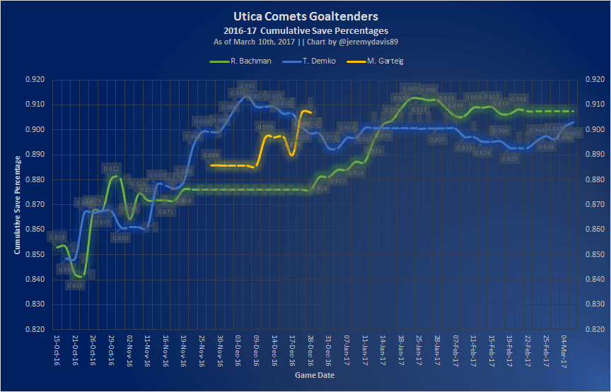 Another common theme has been the solid play of the netminder. With Richard Bachman up in Vancouver, Thatcher Demko has taken the reigns in Utica, and he’s running away with them. The AHL rookie has started five straight games, and won them all.