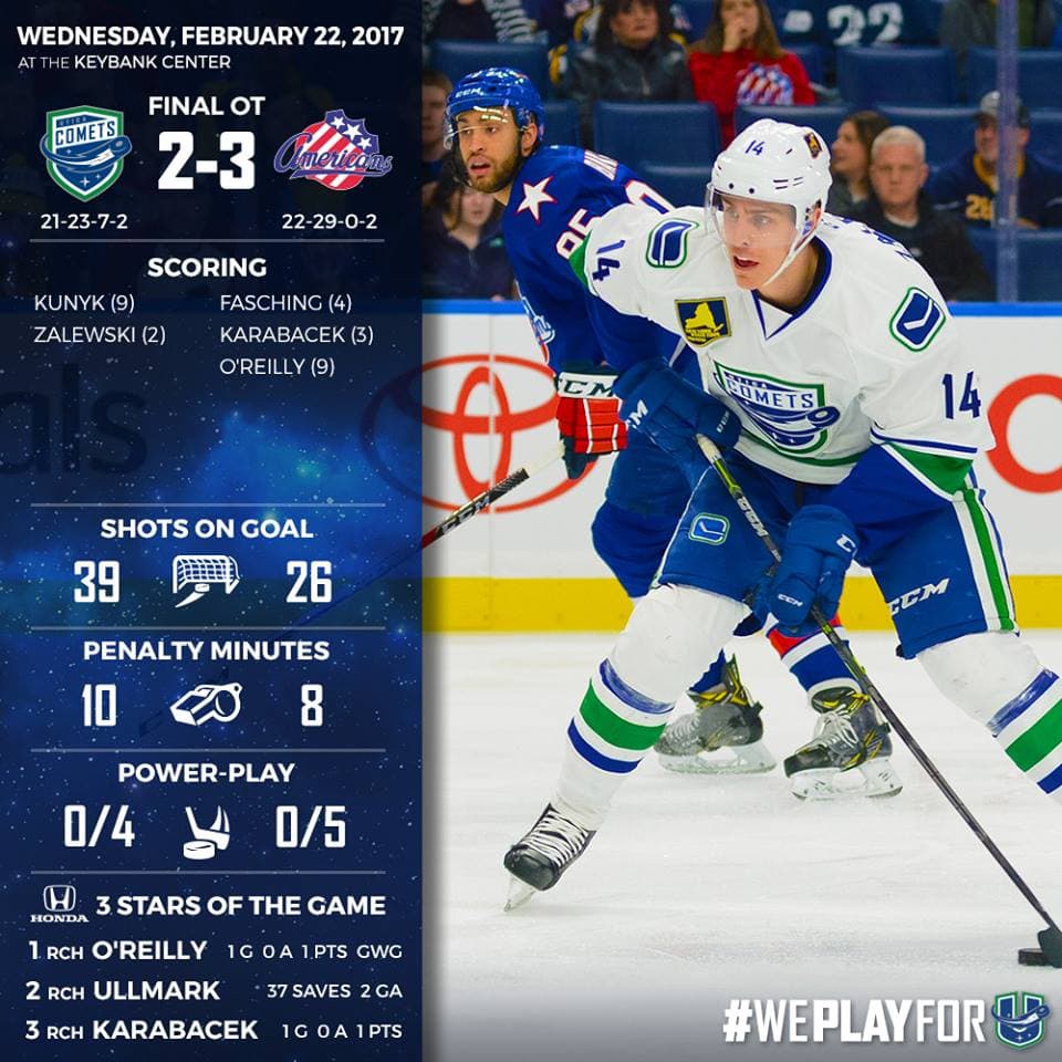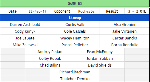 Wednesday, February 22nd at Rochester: 3 – 2 Overtime Loss