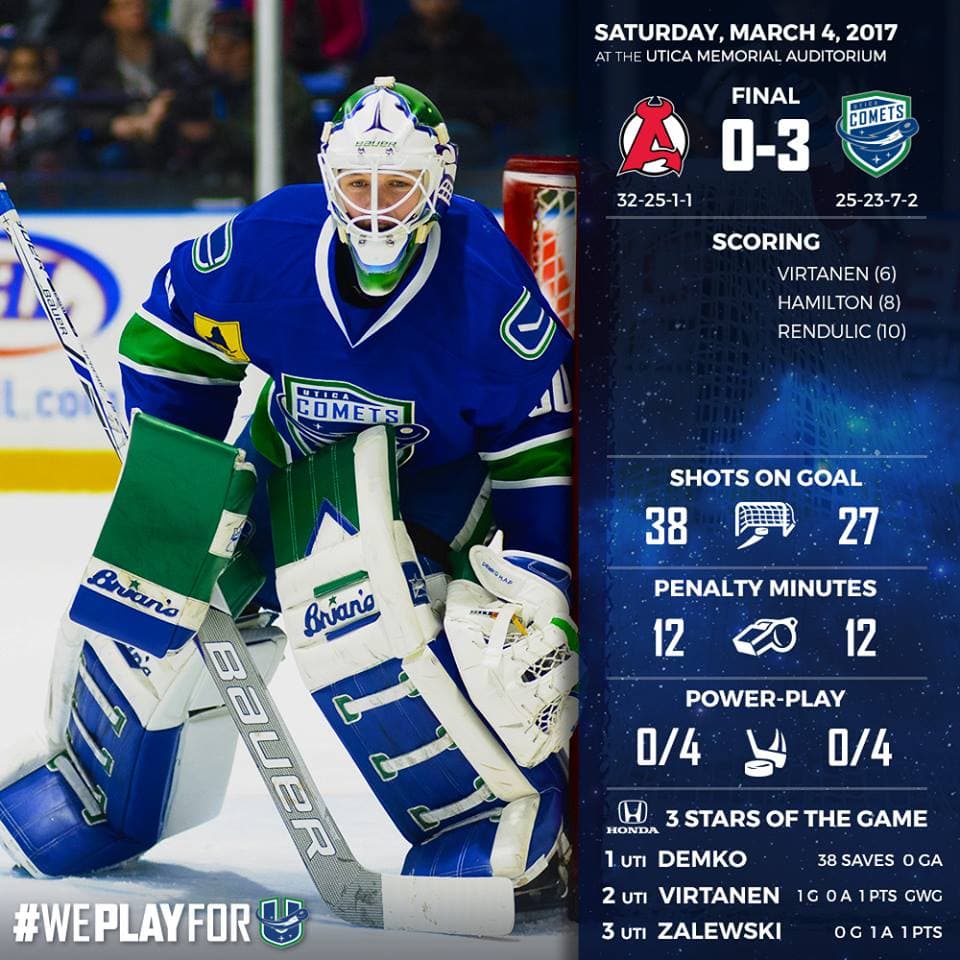 Demko started five straight games for the Comets, which has coincided with the team’s five-game winning streak. Demko stopped 147 of 153 shots over those five games, posting a .961 save percentage and a 1.20 goals against average. The stretch also included his first professional shut out. Hopefully there are many more to come – Demko had 13 shut outs as a member of Boston College, including a whopping 10 in his final season in college.