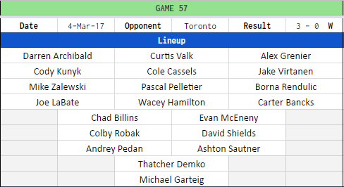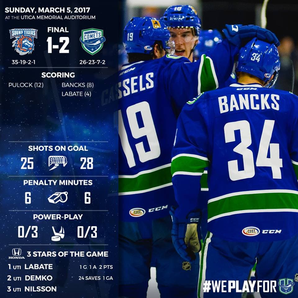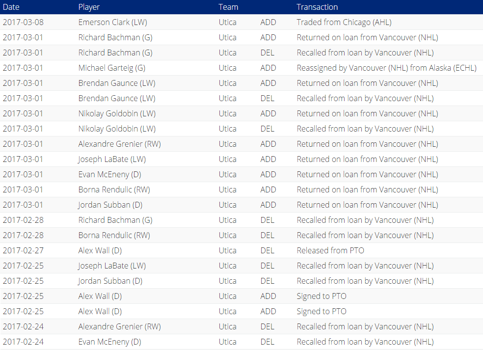 The first event led to recalls and eventual reassignments of Alex Grenier, Evan McEneny, Joe LaBate, Jordan Subban and Borna Rendulic. It also necessitated the signing of Alex Wall to a PTO. The deadline involved the papering down of Brendan Gaunce and Nikolay Goldobin, who are now both eligible for the Calder Cup playoffs. The same is true for Richard Bachman, who is back up on emergency recall with the Canucks in place of Jacob Markstrom. This means that Michael Garteig is back with the Comets.