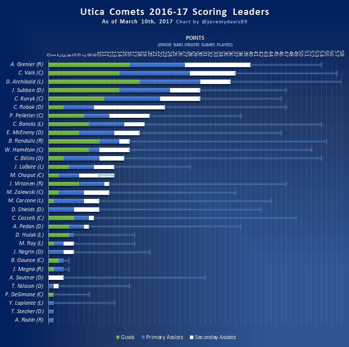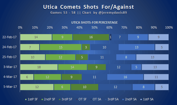 The Comets penalty kill had another strong week, killing off 23 of 25 opposing power play opportunities. Unfortunately their own power play hasn’t been so hot, as they scored just two goals on 23 opportunities (8.7%) over the past six games. That makes a little bit of sense if you consider that they were without a lot of their power play mainstays for a few games, like Grenier, McEneny, and Subban. However, a withering power play has been a pretty common theme over the past several months, so they can’t really blame this one on the mumps.