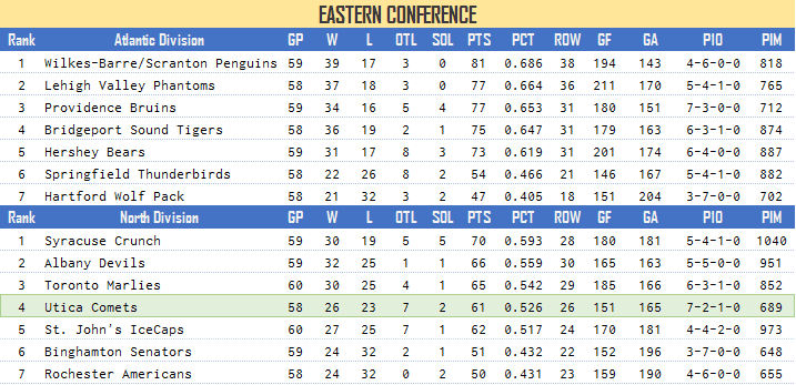 Joyous news! The Comets are locked into a playoff spot as of today, though it’s a tenuous hold. In fact, they actually trail the fifth place St. John’s Ice Caps by a single point, but have a slightly better points percentage because they’ve played one fewer game. The AHL ranks its standings by points percentage because the Californian teams play fewer games than everyone else – but that won’t actually matter for the Comets and Ice Caps, as they’ll end up playing the same amount of games by the end of the year.