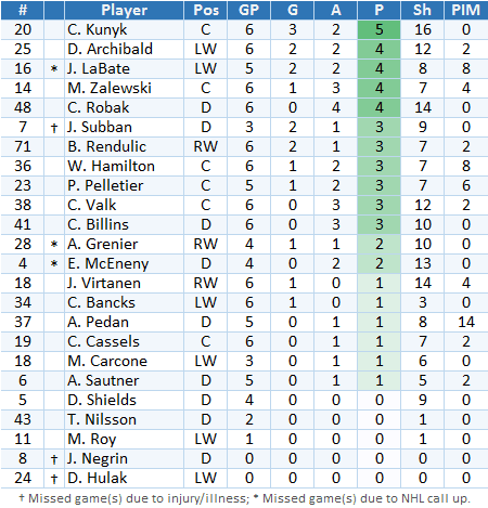 - Curtis Valk had three assists in six games and put 12 shots on net. He was swapped off the top line in favour of Mike Zalewski for Sunday’s game.