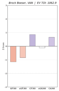 This is reflected in his underlying numbers too, as Boeser was expected to score 11.87 goals at five-on-five but only potted nine. That might not seem like a big difference, but considering he’s only had one season prior in which he underperformed his expected numbers — and that was by less than a goal — it’s certainly worth considering.
