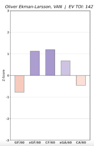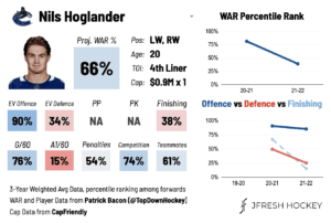 Like Boeser, much of Höglander’s struggles can be attributed to a decline in finishing ability. His player card shows that he was an above-average finisher in his rookie season but struggled mightily last year, but since Höglander’s only been in the league for two seasons, the sample size isn’t large enough to say whether he can be counted on to bounce back in that area.
