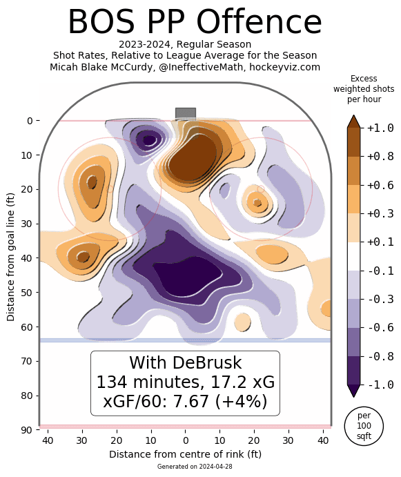 DeBrusk only scored two power play goals last year, and added eight power play assists. That might not read as a great PP addition, but that can be seen as largely a result of DeBrusk only receiving 1:41 of power play time per game, eighth-most on the team.