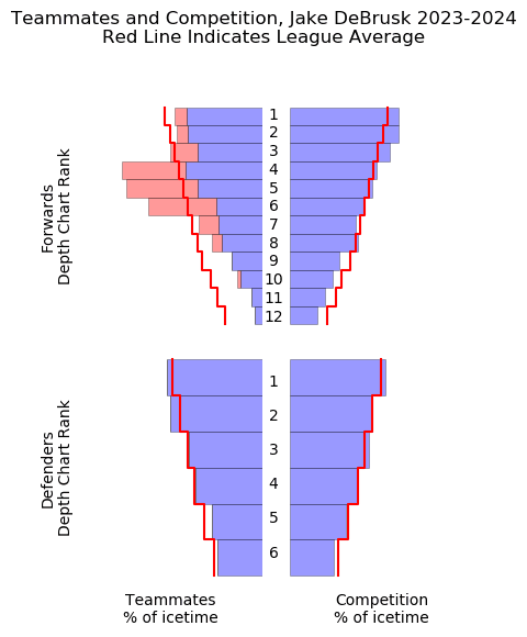 DeBrusk achieves all of this while almost always playing against a much higher quality of competition than his quality of linemates, including a particularly high QoC in 2023/24: