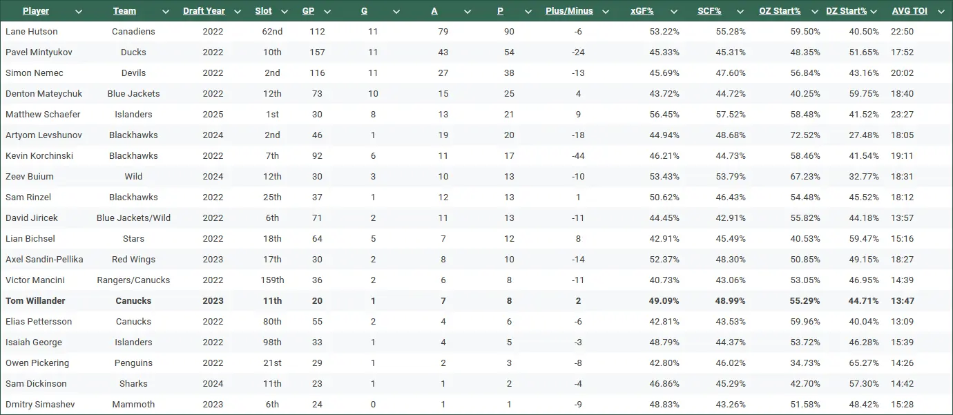 Early in their careers, Willander is outperforming Simashev, who was selected five spots earlier in the 2023 draft, and is roughly on par with Sandin-Pellikka’s results and production. In stark contrast to the vast majority of his peers, however, is that Willander averages less than 14 minutes in ice time. Only teammate Elias Pettersson averages less ice time among these players. The early results and his underlying numbers show that Willander can handle more responsibility.