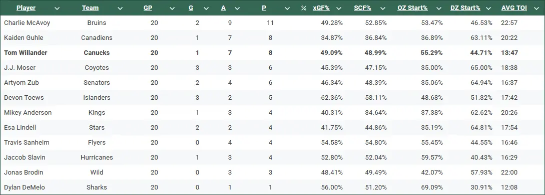 From a pure production standpoint, Willander is tied for second in points over this 20-game sample size. Once again, his xGF% and SCF% hold up very well, sixth and seventh, respectively. These metrics are in line with Jonas Brodin’s numbers. Brodin and Willander are roughly the same size and are both excellent skaters whose offence comes from supporting rather than driving. One primary difference, and this leads to Brodin’s counting stats being very muted, is that the offensive and defensive zone starts between the Wild and Canucks defenders are opposite of each other.