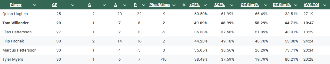 Willander is third in points, one of only two defencemen on the team to have a positive +/-, second to Quinn Hughes in xGF%, and third, barely behind Filip Hronek, in SCF%. In very limited icetime, he’s produced like a top-four defenceman. However, we would be remiss if we didn’t mention his rather gaudy OZ Start%.