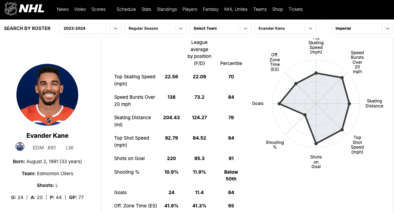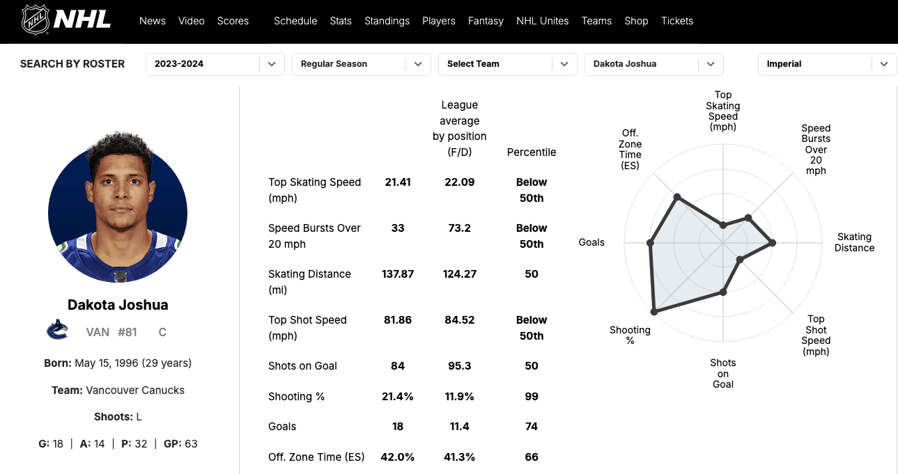 If you look at Joshua’s season, the only edge he had over Kane was a high shooting percentage, which, as we know, is not normally sustainable year after year. Kane had the better top shot speed, more shot volume and better overall skating numbers – just compare the graphs on the right.