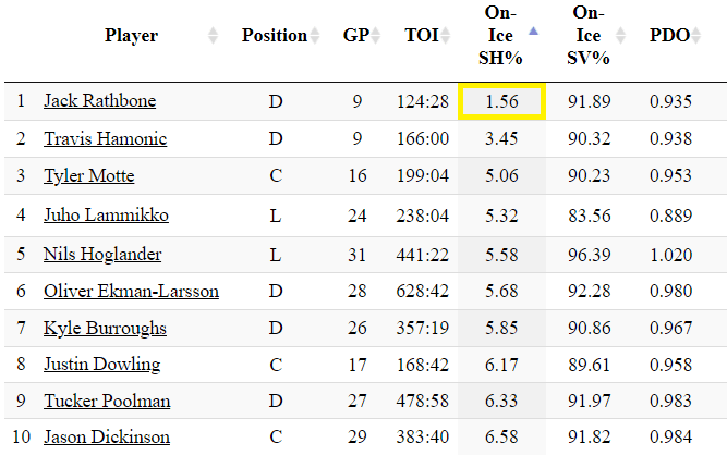 This NHL year has been harsh on Rathbone. In his nine games and 124 minutes, the team was only able to score one goal on 64 shots. That’s a team on-ice shooting percentage of 1.56%. Rathbone’s ice time had the team getting a disallowed goal, multiple posts and just was not getting any luck in his nine-game stint earlier this season.