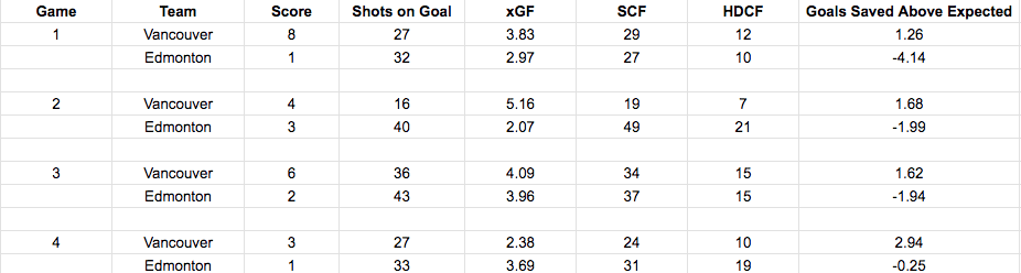 By just looking at the underlying numbers, you’d imagine that the Oilers would be the ones to have won the season series as out-chanced the Canucks in three of four games. However, a bit of this can be categorized as a result of the Canucks having early leads, forcing the Oilers to play with more desperation and offensive zone time.