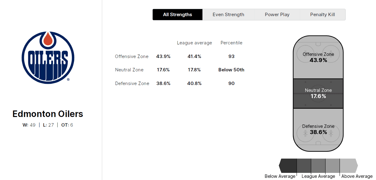 The Oilers spend 43.9% of their time in the offensive zone, which ranks in the 93rd percentile, and 38.6% in the defensive zone, which ranks in the 90th percentile.