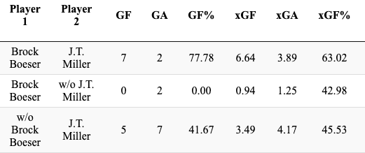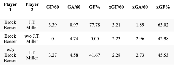 As a result, we now have two relatively similar sample sizes of JT Miller with and without Brock Boeser. Note that the advanced stats in this article are all analyzing 5v5 play, unless specified otherwise.