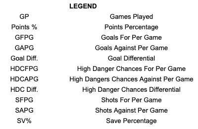 Until this point in the season, the Canucks have held down a playoff spot, but when looking at their record against other playoff teams, that looks like a mirage. Poor offence and too many scoring chances against have prevented any success against stiffer competition. Solid goaltending from Kevin Lankinen and decent shot prevention have allowed for a few wins.