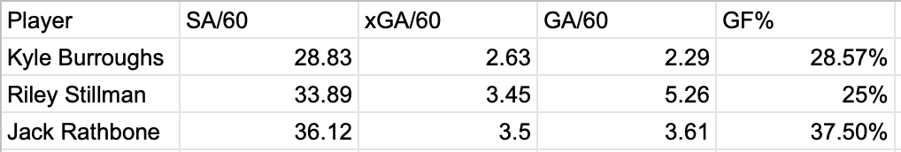 5-on-5 stats for these three Canucks defenders. Columns represent shots against per sixty minutes, expected goals against per sixty minutes, goals against per sixty minutes, and goals for %.