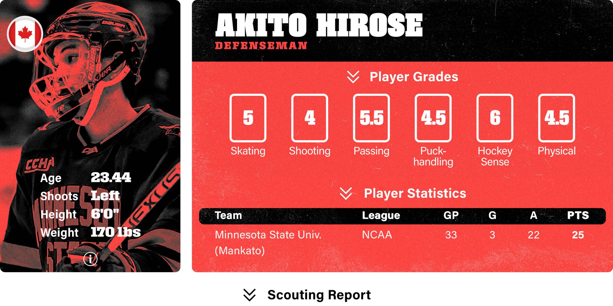 A tough defenceman with above-average skills in every area of the ice, Akito Hirose may not shine on the scoresheet but he has the skating and puck-control skills that you will need to see from an NCAA defenceman to view them as a future pro.He is in his junior season with Minnesota Mankato and with how that program runs, it’s likely that he returns for his senior year. If he is to go pro after his junior year, there should be interest to get him right into the AHL and let him work his way up the depth chart to hopefully one day make it to the NHL.