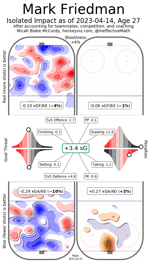 Here’s a look at Mark Friedman’s HockeyViz from his 65 NHL games.
