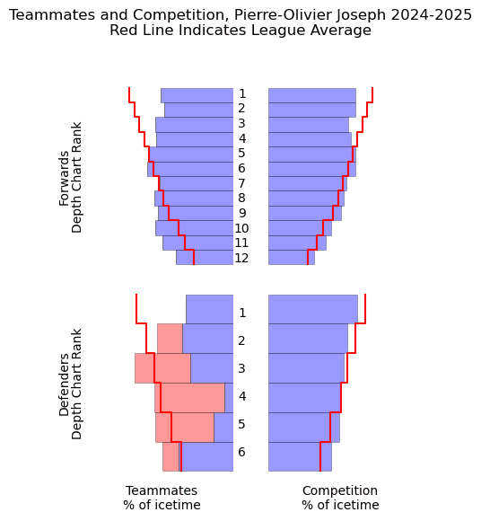 And here’s Joseph’s quality of competition chart, courtesy of HockeyViz, which shows that Joseph’s QoC was a bit below league-average, but then so too was his typical linemate support.