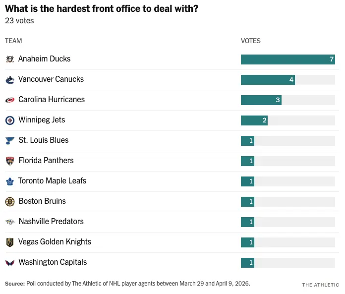 The Canucks received the second most votes (four), behind only the Anaheim Ducks (seven), as the hardest front office to deal with.