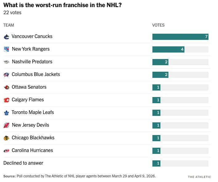 - Canucks voted NHL’s worst run organization in anonymous player agent poll