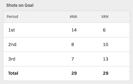 As the rest of the period progressed, the Canucks were finally able to bring their shot total in line with the Ducks. The Ducks were outshooting Vancouver by 2-1 for most of the game, but a big reason why the shot count didn’t reflect what was happening on the ice is because of the large number of times Canucks players missed the net entirely. What momentum there was in this game was certainly with Vancouver, as Anaheim never really had a single moment where they genuinely threatened the Canucks whatsoever.