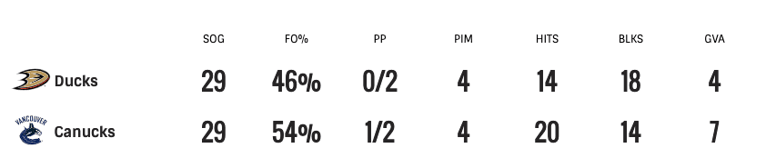 Good news on the roster side of things came in the form of Thatcher Demko being back on the bench as the backup goalie for Vancouver in support of Jacob Markstrom. With Ryan Miller on IR, Kevin Boyle was given the start on the Ducks’ side of the ice, though Anaheim did have to make an emergency call up from their AHL affiliate in San Diego of goalie Angus Redmond to sit as backup.