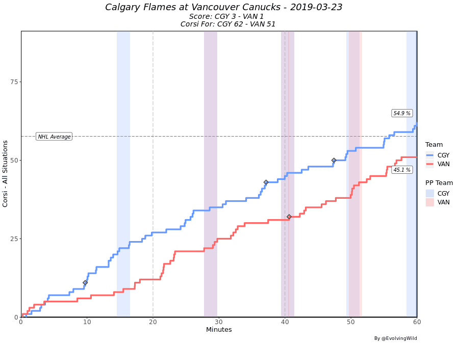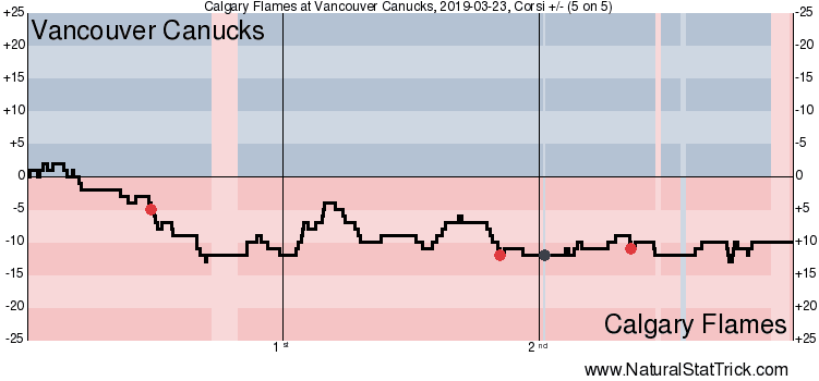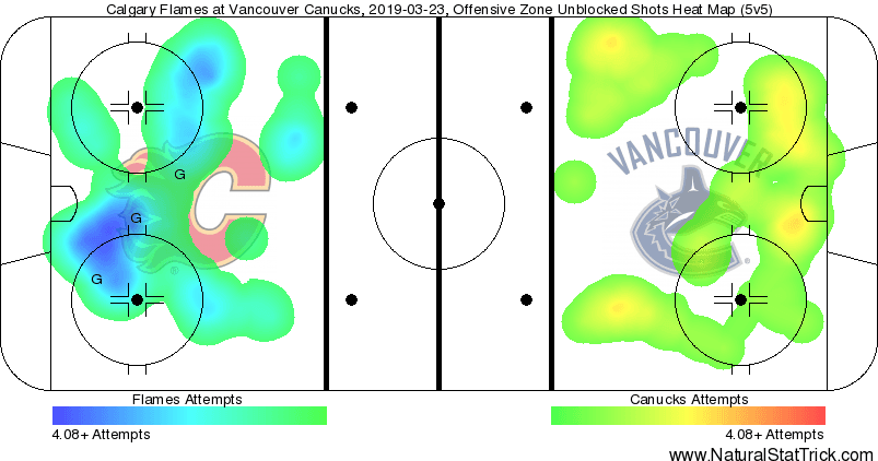 The shot clock wasn’t necessarily on fire, but both teams looked prepared to bring energy and effort to the game. Calgary’s motivation came from wanting to create separation between themselves and San Jose in the standings, so that they draw Colorado in the first round of the playoffs instead of Vegas. The Canucks, meanwhile, have convinced themselves that this recent winning streak, coupled with an upcoming schedule that features relatively weaker opponents, is an opportunity to claw their way back into the playoff conversation at all.