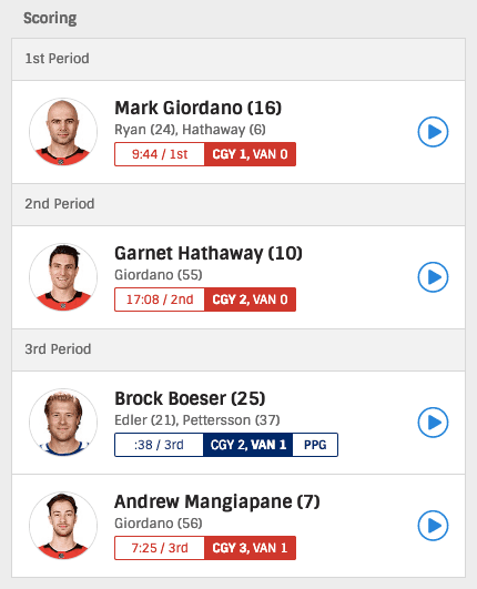 Horvat wins the draw to Markstrom’s left. The play stays alive on the half-wall as both teams struggle to gain possession. The puck breaks free and finds itself on the stick of Garnet Hathaway. Hathaway makes a short pass to Derek Ryan, who circles around behind the net before setting up Mark Giordano for his 16th goal and 70th point of the year.